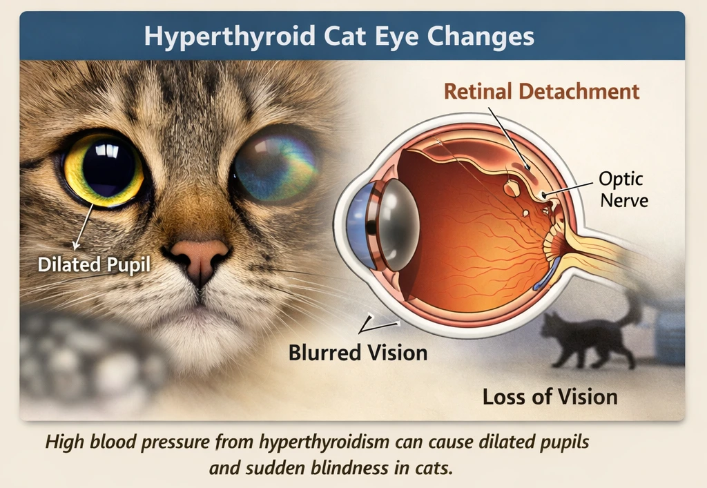 This is among the more frightening symptoms. Eye problems arise due to the increase in blood pressure. Untreated hyperthyroidism in cats is directly related to high blood pressure.