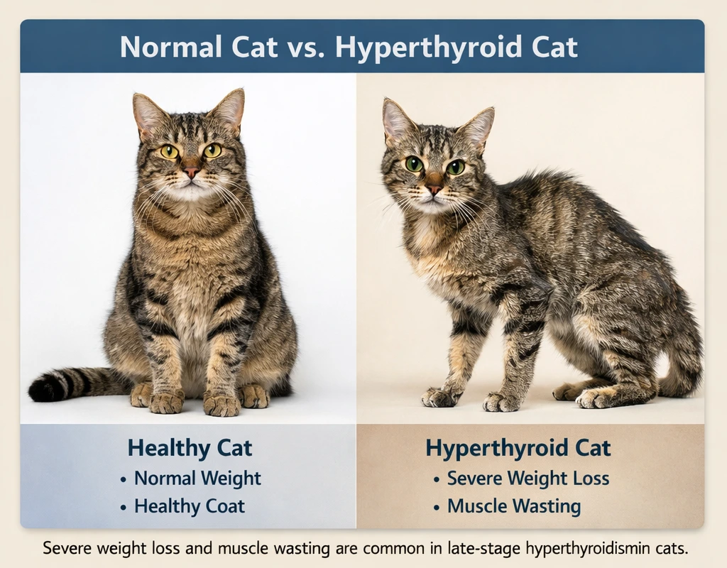 In later stages of feline hyperthyroidism, the loss of weight becomes severe. Even though your cat may be eating a lot, it might appear skinny. Muscle wasting can be observed in the back and shoulders. This is referred to as cachexia. The body is consuming more energy than it can absorb.